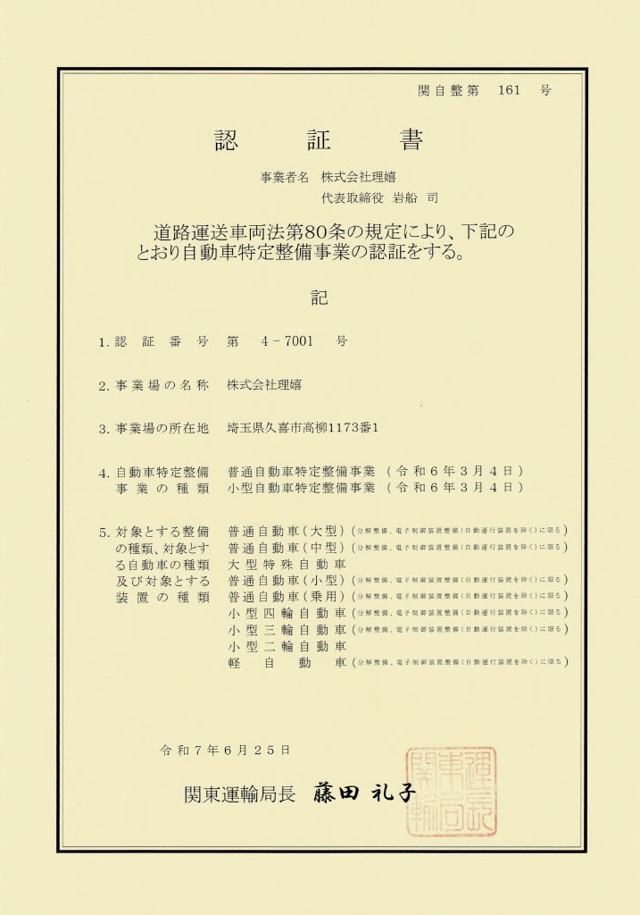 私たちは自動車認証工場として、国土交通省から正式に認証を受けた確かな技術力を持っています。